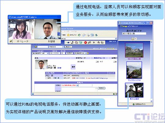 通過“FOMA”的電視電話服務,可以實現(xiàn)面對用戶的表情進行服務。而且,例如,可以實時把握故障發(fā)生地點等只用語言無法準確傳遞的信息。進而,客服人員可以通過FOMA的電視電話功能送出動畫、靜止畫面,利用這些畫面說明情況。通過靈活運用這些功能,為實現(xiàn)顧客和企業(yè)之間的熱情友好、高效細致的通信提供支持。