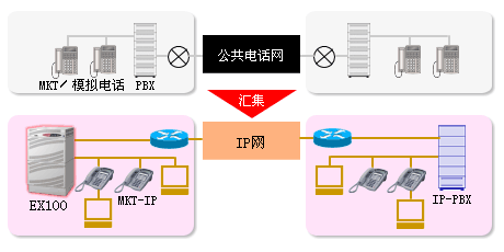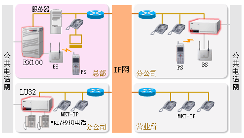 各事業(yè)所的系統(tǒng)利用IP網(wǎng),可以作為設置在總部等地的EX100的內(nèi)線使用。因此,不僅不需要在各事業(yè)所設置PBX/業(yè)務電話設備,而且在小型事業(yè)所也可以應用業(yè)務電話設備無法提供的PBX服務功能。