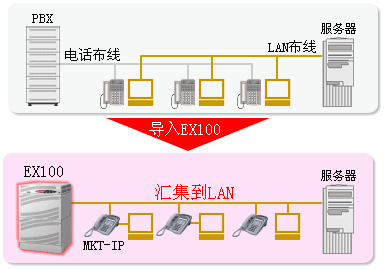 以往,辦公室內(nèi),各事業(yè)所間以分別構(gòu)筑語音,數(shù)據(jù)網(wǎng)絡為主流。而通過IP-PBX式 EX100裝置,可以在IP網(wǎng)上統(tǒng)一這些語音和數(shù)據(jù),簡化系統(tǒng)構(gòu)成。因此,可以大幅度削減各事業(yè)所間通信的運行成本(Running cost)。