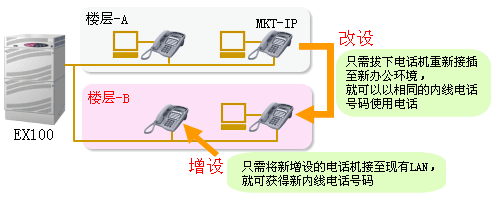 而且,在增設電話機時只需將電話機接到LAN集線器上就完成了電話設置,大幅度削減了以往繁瑣的設置過程及成本。