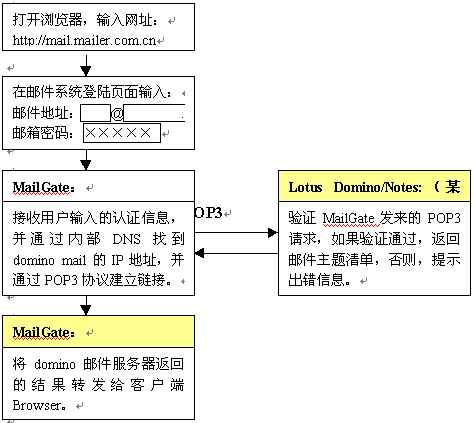 。1) 在不改變現(xiàn)有網(wǎng)絡(luò)硬件、軟件環(huán)境的情況下,添加一臺(tái)郵件網(wǎng)關(guān)服務(wù)器,通過(guò)統(tǒng)一的web登陸界面,輸入Email地址和密碼后,金笛?郵件網(wǎng)關(guān)會(huì)自動(dòng)根據(jù)內(nèi)部DNS找到該用戶所在的Domino Mail Server, 并通過(guò)標(biāo)準(zhǔn)郵件協(xié)議POP3提取該用戶的郵件,以web頁(yè)面形式顯示在用戶屏幕上。
