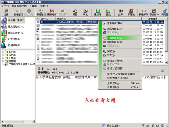 二郎腿短信息群發(fā)平臺(企業(yè)版)功能強大、界面友好(類似OutLook風格,操作簡單),企業(yè)只需很少的投入就可以建立起自己的短信息群發(fā)中心,通過該平臺可以充分利用移動通訊公司提供的短信息服務(wù)功能,來發(fā)布各種行業(yè)相關(guān)信息;如:短信息群組發(fā)送(如:業(yè)務(wù)廣告發(fā)布推廣)、分組發(fā) 送(如:通知各部門的工作人員 ,在不同的時間及時開會)、批處理發(fā)送(自動給不同收件人,發(fā)送不同短信息 如:工資發(fā)放通知含個人工作金額)……,還可以做到由用戶來定制或查詢他所要求的資訊。擁有二郎腿短信息群發(fā)平臺(企業(yè)版)就等于擁有一個信息管理及業(yè)務(wù)增值的有效工具。