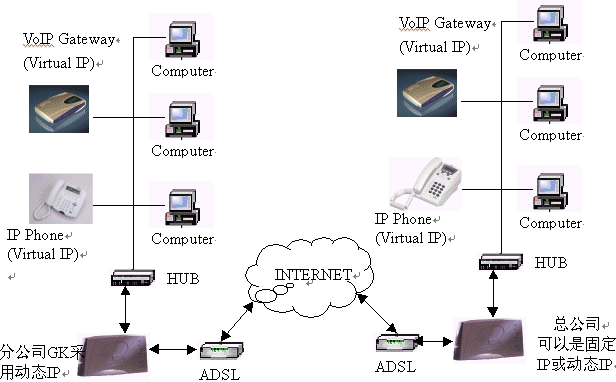 二、應(yīng)用說(shuō)明:完全基于企業(yè)現(xiàn)有網(wǎng)絡(luò)環(huán)境架設(shè)VOIP系統(tǒng),企業(yè)的各分支機(jī)構(gòu)只需申請(qǐng)ADSL寬帶網(wǎng)絡(luò)(有條件的企業(yè)可申請(qǐng)專線及固定IP地址,則系統(tǒng)完全獨(dú)立),安裝晶卡開(kāi)發(fā)的NOZA網(wǎng)守、IP話機(jī)或USB手柄電話,就可實(shí)現(xiàn)免費(fèi)通話。