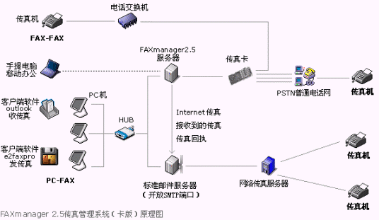 FAXmanager 2.5傳真管理系統(tǒng)安裝在局域網(wǎng)的一臺(tái)專用服務(wù)器上,運(yùn)行環(huán)境可以是:Windows98/NT/2000/XP等,此服務(wù)器可以同郵件服務(wù)器為同一臺(tái)機(jī)器,構(gòu)成企業(yè)郵件/傳真專用服務(wù)器,F(xiàn)AXmanager 2.5可以和企業(yè)郵件系統(tǒng)或群件系統(tǒng)整合使用,可以是Unix/Linux環(huán)境的Qmail和Sendmail等郵件系統(tǒng),也可以是Microsoft Exchange和Lotus Domino/Notes等群件系統(tǒng),當(dāng)然也可以是IComMail等企業(yè)郵件系統(tǒng),也支持虛擬主機(jī)設(shè)置企業(yè)郵局開(kāi)設(shè)POP3帳戶和上網(wǎng)代理服務(wù)器的使用環(huán)境。