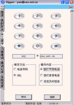 點(diǎn)擊后會(huì)出現(xiàn)對(duì)話窗口,同時(shí)在對(duì)方的機(jī)器上會(huì)出現(xiàn)你的呼叫請(qǐng)求,如果對(duì)方"接收"了你的請(qǐng)求,則兩個(gè)人的語(yǔ)音對(duì)話開始,雙方可以互相聽到聲音,沒(méi)有圖象,可以同時(shí)進(jìn)行短信交流。