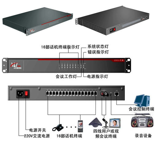 系統(tǒng)提供一個網(wǎng)口,可方便連接計算機;針對各個行業(yè)用戶特殊需求,系統(tǒng)提供一個四線模塊,可連接四線終端、視頻設備、其他會場設備或用于雙系統(tǒng)級聯(lián);通過聯(lián)網(wǎng)的計算機,系統(tǒng)即可獨立使用,也可與計算機協(xié)同使用;系統(tǒng)還提供錄音機接口,可通過錄音機或計算機進行會場錄音。