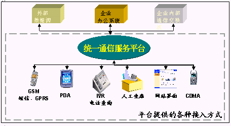 企業(yè)統(tǒng)一通信平臺提供了多種接入方式:人工坐席接入、自動(dòng)語音IVR、GPRS、WAP接入、寬帶接入、短信息接入;同時(shí)還提供了多種信息發(fā)布方式: