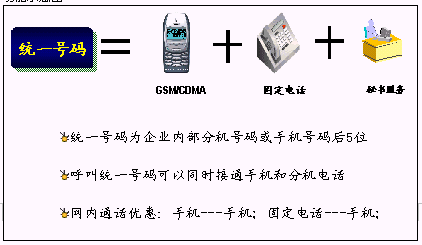 鐵路內(nèi)部員工可以統(tǒng)一所有的通信工具,只使用一個(gè)號碼,一次呼叫便可以完成通信,使通信更加簡單、可靠?梢詫(shí)現(xiàn)換機(jī)換網(wǎng)不換號,用戶獲得一個(gè)終身的聯(lián)系號碼,用戶無論更換任何通信工具,聯(lián)系號碼和方式不會(huì)改變。例如:在路局領(lǐng)導(dǎo)找下屬的時(shí)候,只需要撥打他的統(tǒng)一號碼,便可以直接找到他。不必考慮他是否在外出還是在辦公室,是否更換了手機(jī)號碼。統(tǒng)一號碼就像他員工號碼,始終不變,即撥即通!