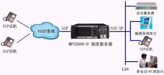 由于MPS2000-D調(diào)度系統(tǒng)本身具有具大的軟交換功能,所以調(diào)度系統(tǒng)既可以與企業(yè)已建成的VOIP系統(tǒng)相連,對VOIP管理的終端進行調(diào)度,又可以對自己管理的用戶進行調(diào)度。系統(tǒng)豐富的資源使其除了具有基本調(diào)度功能外,還具有強大的會議功能,可以實現(xiàn)從3方到幾十、幾百方的全交互會議;還可對調(diào)度過程自動進行錄音備份;使每個分機都具有語音信箱功能;TTS資源的引入,可將文本文件變成語音,使所有調(diào)度成員可以聽文件;ASR資源的引入,改變了以往通過按鍵撥號進行調(diào)度的形式,可直接通過語音呼叫進行調(diào)度,使調(diào)度變得更方便、更快捷。