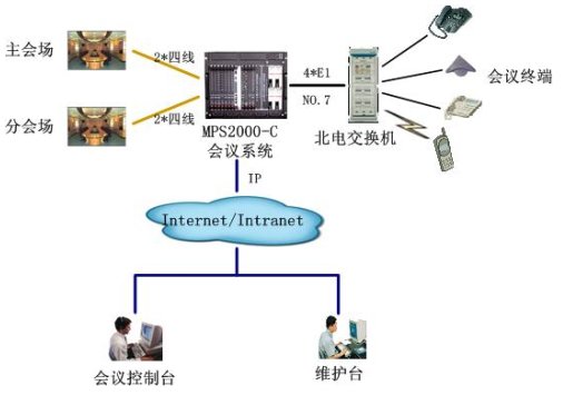 該會議系統(tǒng)通過4個(gè)數(shù)字中繼,與北電用戶交換機(jī)互連,采用七號信令。與視頻會議系統(tǒng)主會場采用四線音頻接口接主會場調(diào)音臺,保證與視頻會議系統(tǒng)音頻的無縫對接。通過以太網(wǎng)口與局域網(wǎng)連接,實(shí)現(xiàn)維護(hù)管理及會議控制等功能。