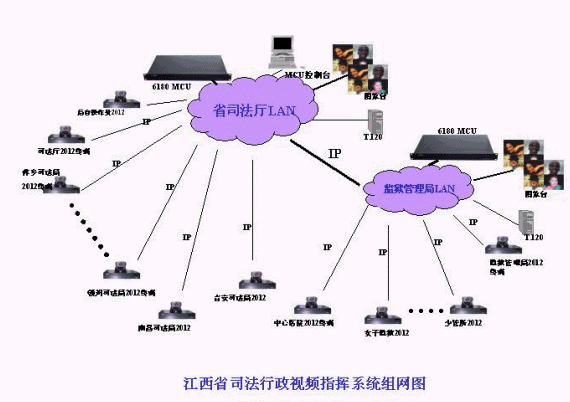 江西司法視頻會(huì)議系統(tǒng)的拓?fù)浣Y(jié)構(gòu)如圖所示。整個(gè)視頻會(huì)議系統(tǒng)為星型拓?fù)浣Y(jié)構(gòu),其中二級(jí)網(wǎng)以省司法廳和省監(jiān)獄管理局為主會(huì)場(chǎng),放置2個(gè)MCU;另外,包括11個(gè)地市司法局的分會(huì)場(chǎng)(南昌、九江、贛州、吉安、撫州、鷹潭、萍鄉(xiāng)、新余、上饒、景德鎮(zhèn)、宜春),14個(gè)監(jiān)獄和農(nóng)場(chǎng)分會(huì)場(chǎng),傳輸網(wǎng)絡(luò)為2M IP網(wǎng)絡(luò),視頻會(huì)議協(xié)議為H.323;司法局和監(jiān)獄管理局也可以單獨(dú)成網(wǎng),在分別依托省司法廳和省監(jiān)獄管理局MCU的情況下,各地市司法局或監(jiān)獄系統(tǒng)可與省司法廳或省監(jiān)獄管理局單獨(dú)進(jìn)行雙向的視頻會(huì)議,整個(gè)系統(tǒng)具有很強(qiáng)的靈活性和擴(kuò)展性。