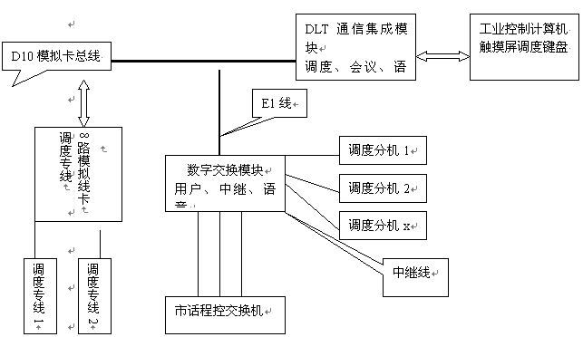 在DLT多路通通信系統(tǒng)平臺中,由于DLT通信集成模塊具有D10總線,可以和模擬環(huán)路用戶卡相連,實現(xiàn)直接用戶線功能,因而可克服上述兩種調度設備的不足,以滿足現(xiàn)代化生產(chǎn)的快速要求、廣域,智能化調度指揮要求。