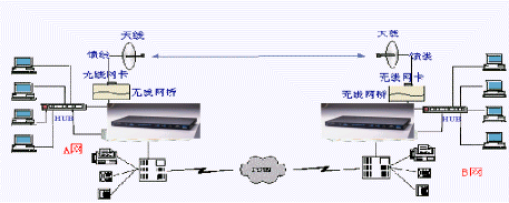 A網(wǎng)與B網(wǎng)分別為兩個局域網(wǎng),通過兩臺WavePoint II無線網(wǎng)橋?qū)蓚局域網(wǎng)連在一起,網(wǎng)橋上的RJ45口或BNC細(xì)纜接口與局域網(wǎng)相連。每臺網(wǎng)橋上插有一塊WaveLAN無線PC卡,PC卡的射頻輸出端口,通過饋線接到天線,通過PC卡來完成無線鏈路的連通。無線網(wǎng)橋連接完成后的效果類似HUB級連。IP語音網(wǎng)關(guān)-HGW-904的局域網(wǎng)接口(RJ45)連接到局域網(wǎng)的HUB上,根據(jù)用戶實際的話務(wù)量,選用Line端口接入用戶電話交換機(jī)(PBX),PBX接普通電話機(jī)和傳真機(jī),并連接至電話公網(wǎng)(PSTN)。其中所需設(shè)備:HGW-904 IP語音網(wǎng)關(guān)2臺;PBX或電話機(jī)的配置可根據(jù)用戶實際需求;無線網(wǎng)橋2臺;無線網(wǎng)卡2塊;天線兩套;饋線若干。 此方案亦可應(yīng)用于兩個需要連接的局域網(wǎng)之間有障礙物遮擋而不可視的情況。此時只需在水平或垂直方向?qū)ふ乙粋能同時看到A與B的位置,并在此位置加入中繼網(wǎng)橋,即可實現(xiàn)A網(wǎng)與B網(wǎng)的連接。實際應(yīng)用中,設(shè)置各異地IP語音網(wǎng)關(guān)的對應(yīng)代碼,在PBX上設(shè)定代表撥打IP電話的數(shù)字,代表PSTN外線電話的數(shù)字。此無線組網(wǎng)方式其實就是已有企業(yè)網(wǎng)的方式,可以完美解決特定地區(qū)布線的困難。特別是廣東地區(qū),工廠特別多,發(fā)展也特別快。有非常多的客戶可以用這種方式來滿足數(shù)據(jù)傳輸及VOIP的需求。