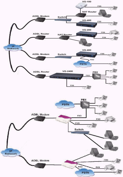 公司已建有Internet或VPN企業(yè)數(shù)據(jù)網(wǎng)絡(luò),對于這種情況,安裝VOIP設(shè)備十分簡單,也非常容易理解?偣救缭拕(wù)量很大時,可選一臺或多臺HSP-2000做堆疊,使用IP sharing功能,以節(jié)省公有(global)IP地址。一般的分公司可選擇1臺VG-902或VG-904做語音網(wǎng)關(guān)。各個點配置的IP接入網(wǎng)關(guān)都可與各種類型的用戶交換機(jī),集團(tuán)電話相連接。移動用戶也可通過本地的VOIP網(wǎng)關(guān)撥打長途電話。沒有專用網(wǎng)絡(luò),采用ADSL上網(wǎng)的企業(yè)也可應(yīng)用Internet建立自己的IP電話網(wǎng)絡(luò)。由于ADSL撥號上網(wǎng)一般不能分配到固定的IP地址,IP語音網(wǎng)關(guān)連接在局域網(wǎng)上,配置的是局域網(wǎng)內(nèi)部IP地址,所以每次上網(wǎng)后不能自動獲取對方的IP地址,導(dǎo)致不能通信。HSP-2000采用獨有的嵌入式Gatekeeper技術(shù)和設(shè)計,支持PPPoE & DHCP 動態(tài)的IP,完全解決了上述問題,滿足了ADSL用戶VOIP的需求。