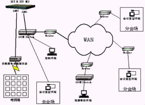 多點控制器采用鼎視通公司的DST H.323 MCS多點控制單元。DST H.323 MCS是鼎視通公司最新研制開發(fā)的高性能媒體交換設備,提供在分組交換網(wǎng)絡平臺之上的多種媒體交換服務。其面向的用戶既可以是企業(yè)、機關、學校等中小規(guī)模用戶,也可以是網(wǎng)絡運營商、業(yè)務提供商等大型用戶。并且它是唯一一款支持電視墻輸出的多點控制單元,同時結(jié)合鼎視通公司的多畫面電視墻服務器實現(xiàn)主會場電視墻的輸出。