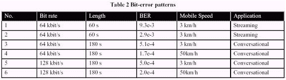 在H.264/AVC的標(biāo)準(zhǔn)化進(jìn)程中,移動(dòng)視頻傳輸?shù)闹匾砸呀?jīng)在3G移動(dòng)傳輸里面通過對(duì)基于H.324M的電路交換會(huì)話服務(wù)、包交換會(huì)話和流服務(wù)得到了證實(shí)。這些測(cè)試情況允許適當(dāng)?shù)木幋a特征、測(cè)試和容錯(cuò)仿真等特征的選擇,同時(shí)也可以得到有意義的測(cè)試結(jié)果。在本文,我們將會(huì)把重心集中在基于IP的測(cè)試情況。在正常的測(cè)試情況下,我們會(huì)定義6個(gè)測(cè)試情形組合,主要測(cè)試通過3G移動(dòng)網(wǎng)絡(luò)的包交換會(huì)話服務(wù)和包交換流媒體服務(wù)。另外,測(cè)試環(huán)境包括簡單的脫機(jī)3GPP/3GPP2仿真軟件、程序接口和評(píng)估標(biāo)準(zhǔn)。無線信道使用專門生產(chǎn)用于移動(dòng)無線信道仿真的位率差錯(cuò)模板來進(jìn)行仿真。 位率差錯(cuò)模板在物理層上和RLC/RLP層下來捕獲,因此,它們?cè)趯?shí)驗(yàn)被用于物理層仿真。通過位率差錯(cuò)模板實(shí)驗(yàn)中得出的碼率、長度、位錯(cuò)誤率和移動(dòng)速度數(shù)據(jù)詳見下表2。