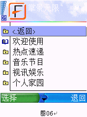 4.現(xiàn)在此軟件支持的媒體網(wǎng)站只有"掌景無(wú)限",估計(jì)以后隨著肥 6 用戶(hù)及在線(xiàn)視頻播放功能的普及,類(lèi)似的網(wǎng)站會(huì)更多,打開(kāi)"掌景無(wú)限",則系統(tǒng)會(huì)提示你所選擇的連接接入點(diǎn),