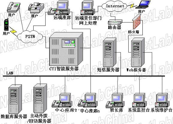 客服中心系統(tǒng)硬件設備由以下核心部件組成:通信智能服務器、數(shù)據(jù)庫服務器、微機、電話機。