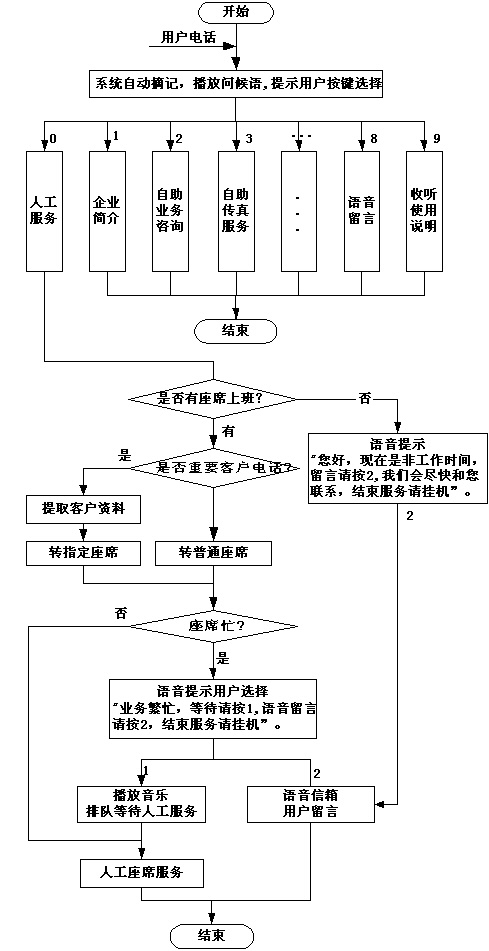 * 外線需要人工服務時,系統(tǒng)自動將來電排隊等候座席接聽;