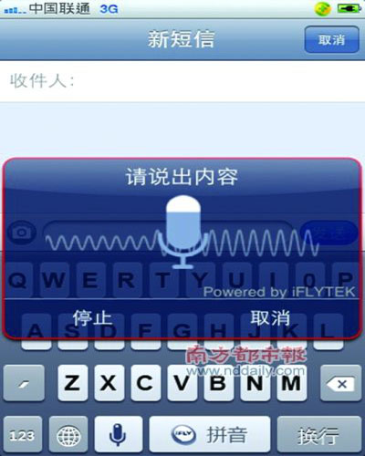 錄入結(jié)束后,點(diǎn)擊“停止”,輸入法會(huì)自動(dòng)開(kāi)始對(duì)剛才錄入的語(yǔ)音進(jìn)行識(shí)別。需要注意的是,這個(gè)時(shí)候只有通暢的3G網(wǎng)絡(luò)或者W IFI網(wǎng)絡(luò),才能順利識(shí)別;如果信號(hào)欄顯示“E”或者“O”,都將無(wú)法得到正確識(shí)別,也無(wú)法錄入短信內(nèi)容。
