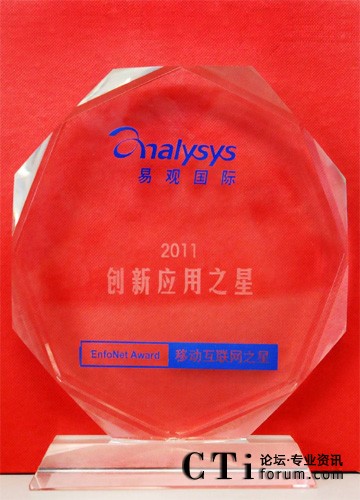 易觀國際成立于2000年,是中國信息化、互聯(lián)網(wǎng)和新媒體以及電信運營行業(yè)規(guī)模最大的中國科技市場領(lǐng)先的研究和咨詢機構(gòu)。2011易觀“EnfoNet Award–移動互聯(lián)網(wǎng)之星”評選是易觀年度產(chǎn)業(yè)盛會——首屆移動互聯(lián)網(wǎng)博覽會暨第四屆易觀移動互聯(lián)網(wǎng)年會的重要組成部分,是易觀國際(Analysys International)為推薦中國互聯(lián)網(wǎng)及移動互聯(lián)網(wǎng)產(chǎn)業(yè)中表現(xiàn)優(yōu)異且具備發(fā)展?jié)摿Φ钠脚_及應(yīng)用而設(shè)立。