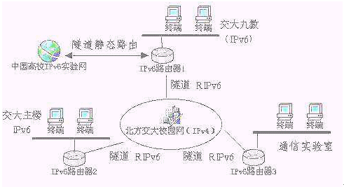 FH6501(IPv6路由器)已經(jīng)在北方交通大學(xué)學(xué)生IPv6實(shí)驗(yàn)床實(shí)際安全運(yùn)行了六個(gè)月。北方交通大學(xué)學(xué)生IPv6實(shí)驗(yàn)床采用我公司IPv6路由器產(chǎn)品,架構(gòu)了三個(gè)主節(jié)點(diǎn),借助隧道連接到由Nokia資助建設(shè)的中國高校IPv6實(shí)驗(yàn)床。目前三個(gè)主節(jié)點(diǎn)之間的連接是借助于學(xué)校原有的IPv4網(wǎng)絡(luò),通過隧道技術(shù)實(shí)現(xiàn)節(jié)點(diǎn)間的通信(見圖示)。
