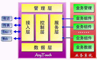 AnyTouch不僅僅是一個(gè)面向應(yīng)用開(kāi)發(fā)商、系統(tǒng)集成商的CTI中間件產(chǎn)品,而且提供支持最終用戶(hù)自我維護(hù)、開(kāi)發(fā)、編輯的業(yè)務(wù)接口與開(kāi)發(fā)工具包;贏nyTouch,可以根據(jù)不同的行業(yè)需求開(kāi)發(fā)出不同的業(yè)務(wù)應(yīng)用系統(tǒng),從而構(gòu)筑屬于自己的呼叫中心、企業(yè)增值服務(wù)、通訊服務(wù)、信息服務(wù)及CRM系統(tǒng)。