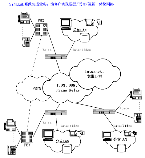 在這里,數(shù)據(jù)/話音/視頻一體化網(wǎng)絡(luò)主要是指多分支機(jī)構(gòu)集團(tuán)化企業(yè),通過ISDN、DDN、Frame Relay、Internet、寬帶IP等廣域網(wǎng)互聯(lián)手段,實(shí)現(xiàn)Data/Voice/Video"總線復(fù)用"的增值技術(shù)。