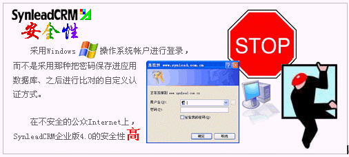 SynleadCRM企業(yè)版4.0采用了高度捆扎操作系統(tǒng)安全性的域帳戶認(rèn)證,而不是在應(yīng)用層面自定義用戶認(rèn)證策略。事實(shí)上,SynleadCRM從一開始就基于這種安全機(jī)制并且不斷完善,以避免今后無法向更高端邁進(jìn)。