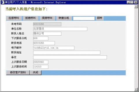 4、來電顯示:當(dāng)有外線電話撥入坐席,坐席電話振鈴的同時(shí),會在顯示器上彈出新窗口顯示來電用戶的信息;