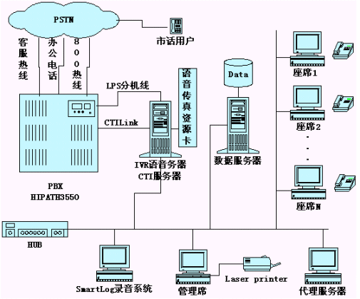 系統(tǒng)是由一臺Siemens HiPath交換機(jī),一臺CTI,IVR語音服務(wù)器,一臺SmartLog錄音監(jiān)聽服務(wù)器構(gòu)成。系統(tǒng)的連接方式如上圖。系統(tǒng)目前共設(shè)置了12個(gè)人工座席,根據(jù)業(yè)務(wù)的不同分為寶健之友及代理商座席和專賣門市座席,每個(gè)人工座席有電腦一臺,人工座席的電腦與CTI,IVR語音服務(wù)器及數(shù)據(jù)庫服務(wù)器共處一個(gè)局域網(wǎng)內(nèi)。