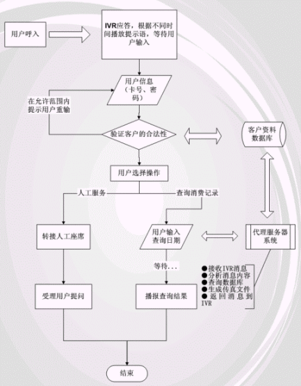 用戶通過客戶服務(wù)熱線呼入呼叫中心系統(tǒng),由通信網(wǎng)關(guān)接入IVR系統(tǒng),進(jìn)入IVR流程,用戶輸入基本信息,如卡號、密碼等,IVR系統(tǒng)將查詢客戶資料,驗(yàn)證其合法性,如果是合法會員,IVR系統(tǒng)會以語音合成的方式播報(bào)客戶姓名,人性化的設(shè)計(jì)盡在其中。用戶可以進(jìn)一步選擇人工服務(wù)或語音查詢,人工服務(wù)將由UltraCTI呼叫中心服務(wù)器根據(jù)座席的工作狀態(tài)自動將呼叫分配到某一座席,同時(shí)將用戶的信息通過TCP/IP網(wǎng)絡(luò)協(xié)議一并發(fā)送,服務(wù)人員接受呼叫,同時(shí)自動根據(jù)用戶信息在座席的客戶端彈出受理信息界面。客戶與服務(wù)人員在交流的過程中,可以查詢產(chǎn)品信息庫等,當(dāng)咨詢完畢時(shí),呼叫結(jié)束,座席空閑,等待下一次呼叫。