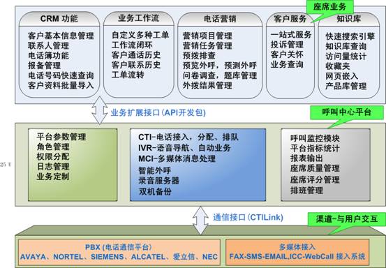 包含了PBX、CTI服務(wù)器、IVR/FAX服務(wù)器、錄音監(jiān)控 系統(tǒng)、報表統(tǒng)計系統(tǒng),CRM客戶管理等。