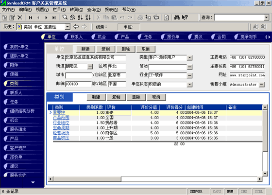 客戶單位的分類較聯(lián)系人的分類更復(fù)雜。常用的分類有:按照企業(yè)規(guī)模來(lái)分類(大、中、小,層次自定義,下同)、按照該客戶與本單位的緊密程度分類(緊密、普通、疏遠(yuǎn))、按照該客戶的重要性分類(重要、普通、次要)、按照該客戶的忠誠(chéng)度分類(忠誠(chéng)、普通、游移)。有一些用戶企業(yè),希望對(duì)客戶單位特征進(jìn)行采集,進(jìn)而進(jìn)行客戶信用評(píng)價(jià)。信用特征的類別可以多達(dá)數(shù)十種類(詳細(xì)情況可參考有關(guān)書籍)。利用SynleadCRM,您可以為每個(gè)類指定系數(shù),為類下屬的每個(gè)評(píng)價(jià)指定評(píng)分分值。例如,您可以建立一個(gè)類別為"客戶倉(cāng)庫(kù)積壓商品的情況",系數(shù)為1,該類別下屬的評(píng)價(jià)有"很多1分"、"一般3分"、"少1分"、"未知0分",如果指定某客戶該類別的評(píng)價(jià)為一般,則該項(xiàng)目得分為3分*1(系數(shù))=3分。依此類推,您還可以指定更多的分類與評(píng)價(jià),例如:客戶經(jīng)營(yíng)場(chǎng)所所處的位置、客戶在企業(yè)生命周期中所處的位置、客戶在行業(yè)中的地位、客戶產(chǎn)品的組合情況、客戶產(chǎn)品覆蓋的市場(chǎng)范圍、客戶產(chǎn)品的淡旺季規(guī)律、客戶近年?duì)I業(yè)額的增減趨勢(shì)、客戶的年度營(yíng)業(yè)額、客戶的現(xiàn)金周轉(zhuǎn)能力、客戶的負(fù)債情況、客戶是否涉及中大訴訟等。每一個(gè)類別項(xiàng)目的評(píng)分經(jīng)過(guò)系數(shù)的加權(quán)運(yùn)算后,可以求和,得到這個(gè)客戶的總評(píng)分。未來(lái)也可以利用分析模型對(duì)此類數(shù)據(jù)進(jìn)行進(jìn)一步的分析,提供輔助決策所需要的圖表和報(bào)表。
