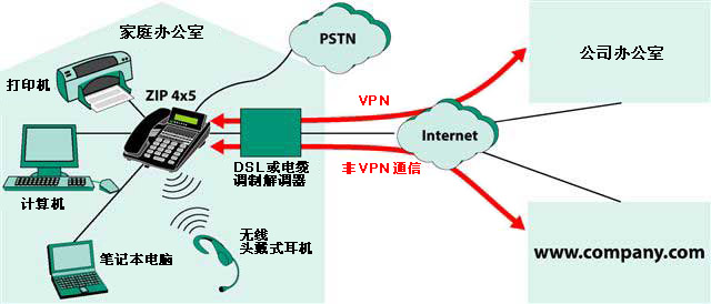 該電話包含有 DHCP 服務(wù)器和 NAT,因此,可以在該電話的下游安置其他設(shè)備。此外,該電話還針對每個端口提供了 VPN 隧道,這樣,便可以將諸多 PC 納入公司網(wǎng)絡(luò)。來自其他端口的通信或者發(fā)往 Internet 的通信不通過 VPN 隧道。遠程工作者可以像在辦公室工作一樣,訪問所有公司資源。當(dāng)有電話撥進公司辦公室時,它會被定向到遠程工作者的電話上。同樣,也可以通過公司辦公室的電話系統(tǒng)向公司辦公室及公司外部的用戶發(fā)送出站呼叫。對于本地呼叫,遠程工作者可以使用直接插入 ZIP 4x5 中的 PSTN 連接。撥打緊急號碼時,ZIP 4x5 可以自動將呼叫路由到本地 PSTN。