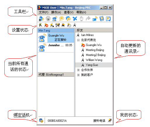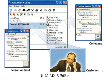 使用MXIE還提供了文本交流、收發(fā)語(yǔ)音郵件、收發(fā)傳真、發(fā)起電話會(huì)議或視頻會(huì)議、綁定話機(jī)等多種實(shí)用的溝通功能。除此以外,MXIE還集成了軟件電話功能,用戶(hù)外出時(shí)可以使用它來(lái)接聽(tīng)或撥打電話。