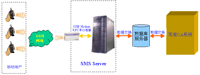 短信收發(fā)服務器是通過數(shù)據(jù)交換的方式與您的系統(tǒng)進行連接,目前支持數(shù)據(jù)庫的交換方式,可以通過Oralce、MS SQL SERVER 、MS ACCESS等關系型數(shù)據(jù)庫和現(xiàn)有系統(tǒng)進行數(shù)據(jù)交換。