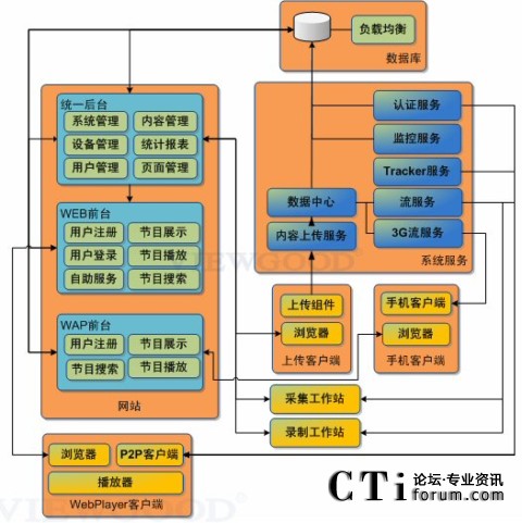 系統(tǒng)由“統(tǒng)一”管理后臺(tái)、Web前臺(tái)、WAP前臺(tái)、WebPlayer播放器、手機(jī)客戶端、采集工作站、錄制工作站、上傳客戶端、服務(wù)系統(tǒng)組成。之前已經(jīng)使用我們PC流媒體服務(wù)平臺(tái)的用戶,可以與手機(jī)流媒體系統(tǒng)合用一個(gè)后臺(tái)管理,實(shí)現(xiàn)了手機(jī)和PC平臺(tái)的統(tǒng)一后臺(tái)管理。