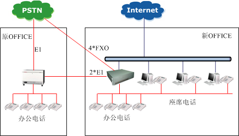 總部目前已有電話用戶交換機一臺,滿足總部所有員工的電話需要,而分部需要新建電話網(wǎng)絡(luò),使之和總部能組網(wǎng),滿足短號互撥,不產(chǎn)生費用的要求。
