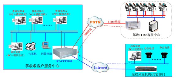在本次項(xiàng)目中,莎啦啦計(jì)劃前期部署一個(gè)E1中繼,20路人工坐席,并且提供全國(guó)統(tǒng)一的400-710-6600服務(wù)熱線,融天的RT-CCP1000平臺(tái)再次以一體化和IP接入兩大特點(diǎn)獲得用戶的最終認(rèn)可,系統(tǒng)網(wǎng)絡(luò)圖大致如下:
