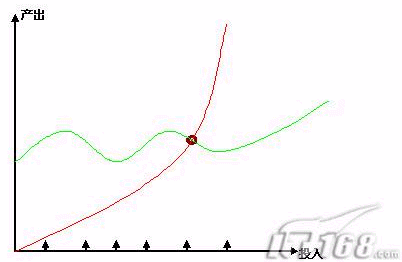 我們可以看到,投入和產(chǎn)出是按月增長(zhǎng)的,那么億美目前呢,是(綠線)慢慢增長(zhǎng)的一個(gè)曲線,隨著投入增加,持續(xù)是一個(gè)規(guī)模性的增長(zhǎng)。這類(lèi)似一個(gè)2003-2005年,持續(xù)是這樣一個(gè)營(yíng)銷(xiāo)型的穩(wěn)步增長(zhǎng)。那么,從2006年開(kāi)始,這個(gè)地方(棕色)的出現(xiàn),開(kāi)始出現(xiàn)新的變化和新的增長(zhǎng)方式,那么我們說(shuō)這個(gè)點(diǎn)叫做拐點(diǎn)。那么傾斜角度和產(chǎn)出就發(fā)生了變化了。那么比如今后發(fā)展到一個(gè)階段,新的平臺(tái),新的內(nèi)容出來(lái)后,那么這個(gè)拐點(diǎn)也同樣會(huì)發(fā)生變化。