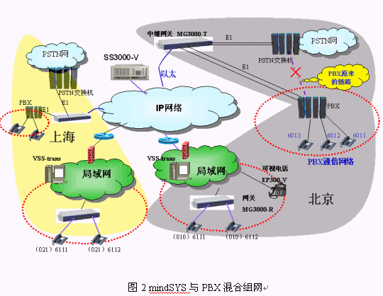 我們建設(shè)mindSYS系統(tǒng)的時候基本上不改變原來PBX的布線和配置,PBX原來的數(shù)字中繼直接連接到運營商的程控交換機,我們現(xiàn)在只是將PBX的數(shù)字中繼連接到中繼網(wǎng)關(guān)MG3000-T。PBX通信系統(tǒng)的電話完全沒有改變,還使用原來的電話號碼,打分機直接撥小號,打外線先撥0。mindSYS系統(tǒng)下的電話使用方式也完全一樣,對用戶來說就是一套系統(tǒng)。如北京的6011可以直接撥打6111,6111用戶也可以直接撥打6011,6111打外線先撥0,如062043020。北京的用戶呼叫異地用戶需要撥打完整號碼(大號),如北京的6011用戶撥0216111就可以接通上海的用戶,反之亦然。mindSYS系統(tǒng)的電話(圖2的所有電話)之間通話都免費。這樣我們的行業(yè)用戶可以既不改變原來的使用習慣,又能夠靈活的規(guī)劃各地的電話號碼來完成一個大型的跨地域的電話系統(tǒng)。