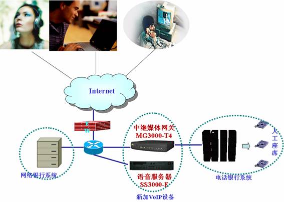 如圖,新加SIP融合通信平臺SS3000-E,完成客戶端軟電話的注冊、呼叫控制等功能;部署中繼媒體網(wǎng)關(guān)連接數(shù)據(jù)網(wǎng)絡(luò)和電話銀行系統(tǒng)的程控交換機(jī)。