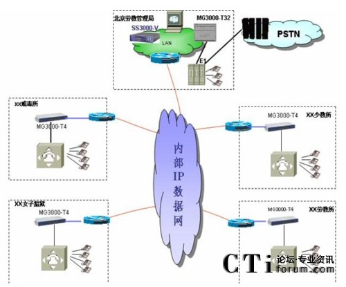 根據(jù)北京監(jiān)獄管理局情況大唐高鴻提出在監(jiān)獄系統(tǒng)現(xiàn)有的網(wǎng)絡(luò)建立IP語音系統(tǒng),使各地監(jiān)獄之間的語音服務(wù)運營在現(xiàn)有完善的IP網(wǎng)絡(luò)上,實現(xiàn)“語音、數(shù)據(jù)、視頻三網(wǎng)合一”的先進(jìn)網(wǎng)絡(luò)。