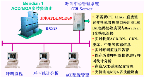 華呼CCM系統(tǒng)不需要Meridian Link,直接通過交換機(jī)管理串口采用HSL(High-Speed Link)和LML(Load Management Link)鏈路協(xié)議實(shí)現(xiàn)與Meridian 1交換機(jī)連接;實(shí)時(shí)收集ACD座席、隊(duì)列、中繼等狀態(tài)信息,提供實(shí)時(shí)監(jiān)控和告警;保存各類歷史呼叫數(shù)據(jù),提供多種統(tǒng)計(jì)分析手段;提供ACD有關(guān)參數(shù)的實(shí)時(shí)和預(yù)定配置管理功能;支持北電MQA(Multiple Queue Assignment)技能路由功能,使座席可同時(shí)登錄到5個(gè)ACD隊(duì)列,在交換機(jī)內(nèi)部實(shí)現(xiàn)技能路由;對(duì)各類數(shù)據(jù)分析以表格、直方圖、餅圖等方式進(jìn)行直觀顯示并可進(jìn)行打印,以及提供多樣的告警提示。