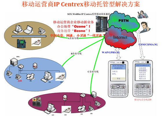 Mail,可發(fā)起WAP電話會(huì)議,可訪問企業(yè)的CRM、ERP等應(yīng)用軟件并集成點(diǎn)擊呼叫等等)。不僅移動(dòng)運(yùn)營(yíng)商可以替代第一代的移動(dòng)總機(jī),固網(wǎng)運(yùn)營(yíng)商采用SOX-M移動(dòng)軟交換也可以輕松的開展移動(dòng)總機(jī)(小靈通或手機(jī))的業(yè)務(wù)了,但SOX-M系統(tǒng)融合移動(dòng)運(yùn)營(yíng)商的無線互聯(lián)網(wǎng)數(shù)據(jù)業(yè)務(wù)將產(chǎn)生更大的利于企業(yè)應(yīng)用的前景,移動(dòng)總機(jī)(語音+WAP)的融合應(yīng)用成為第二代移動(dòng)總機(jī)殺手級(jí)應(yīng)用,令移動(dòng)總機(jī)如虎添翼。