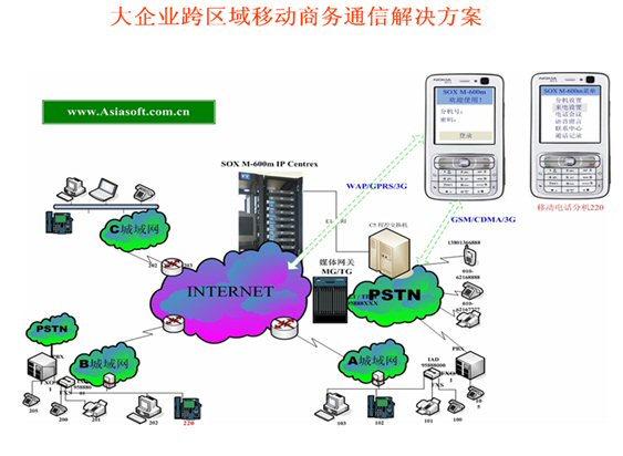 該方案為企業(yè)提供了跨地域的低成本、高效率、方便靈活的IP融合通信基本服務(wù)和增值服務(wù),使用SOX-M就不再有地域限制,宛如本地化電話分機(jī)辦公通信一樣,而且還可以享有更多的增值服務(wù):語音信箱、電話會(huì)議、一號(hào)通、等候音樂、語音菜單、呼叫篩選等等,更具特色的是提供了融合通信的新型“移動(dòng)總機(jī)”和“移動(dòng)分機(jī)”服務(wù),可以使我們手里的移動(dòng)電話(即手機(jī))完全成為辦公室分機(jī),可以在手機(jī)上完成固定分機(jī)的PBX特性功能,如在線轉(zhuǎn)接,即時(shí)會(huì)議等,通過SOX-M可以直接管理分機(jī)各種設(shè)置,如“來電管理、手機(jī)聽取語音留言、WAP上召開電話會(huì)議、聯(lián)系中心(CRM)WAP點(diǎn)擊呼叫”等等,實(shí)現(xiàn)了語音和數(shù)據(jù)融合通信給企業(yè)帶來的更多好處。