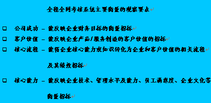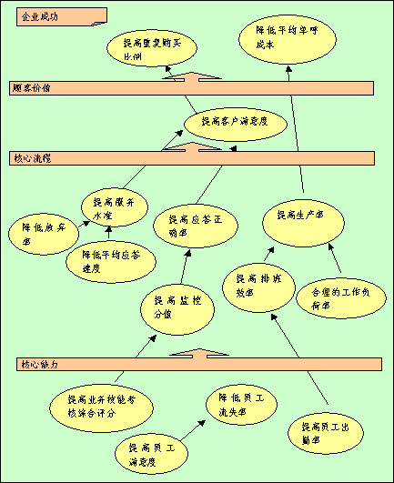 全程全網(wǎng)考核策略目標因果關系圖是"平衡計分卡"應用的重要環(huán)節(jié),在此要特別強調?因為它是將根據(jù)公司遠景規(guī)劃以及使命確定的四個考核維度轉化為全程全網(wǎng)考核系統(tǒng)進入實際操作階段之關鍵步驟。在平衡記分卡的設計過程中,它起著承前啟后的作用,在構建呼叫中心全程全網(wǎng)考核系統(tǒng)中全程全網(wǎng)考核策略目標因果關系圖的突破性銜接功能-以其邏輯性的架構來界定和描述實現(xiàn)全面績效考核的策略方案。將公司成功、客戶價值、核心流程和呼叫中心核心能力之間的關聯(lián)清晰地呈現(xiàn),并將企業(yè)的策略與其績效衡量系統(tǒng)相銜接。