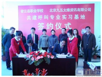 12月18日上午,密云縣職業(yè)學(xué)校與北京九五太維資訊有限公司校企合作共建呼叫專業(yè)實(shí)習(xí)基地簽約儀式在密云縣職業(yè)學(xué)校隆重舉行,市教委職成處處長(zhǎng)李敏,縣委常委副縣長(zhǎng)王春林、副縣長(zhǎng)錢福生、副縣長(zhǎng)徐芳出席簽約儀式并發(fā)表了講話。密云縣教委主任李鐘勤,北京九五太維資訊有限公司董事長(zhǎng)汪遠(yuǎn),首席執(zhí)行官李寶民及其培訓(xùn)師團(tuán)隊(duì),密云縣經(jīng)濟(jì)開(kāi)發(fā)區(qū)總公司及部分入?yún)^(qū)呼叫企業(yè)出席了簽約儀式。此次活動(dòng)標(biāo)志著北京呼叫中心產(chǎn)業(yè)基地人才培養(yǎng)工作步入正軌,隨著以密云縣職業(yè)學(xué)校為主體的人才培養(yǎng)模式的確立,長(zhǎng)期困擾呼叫行業(yè)人才短缺的困難有望得到解決。
