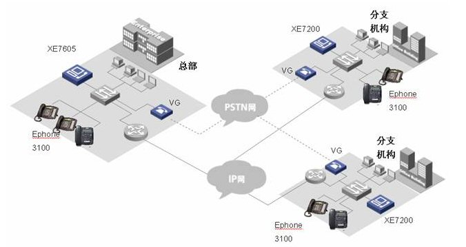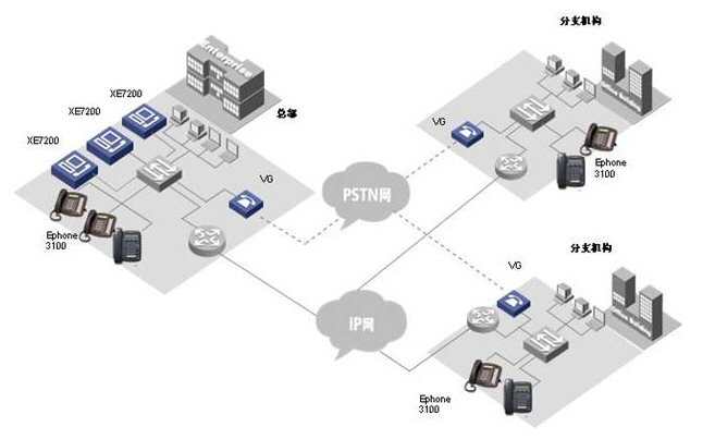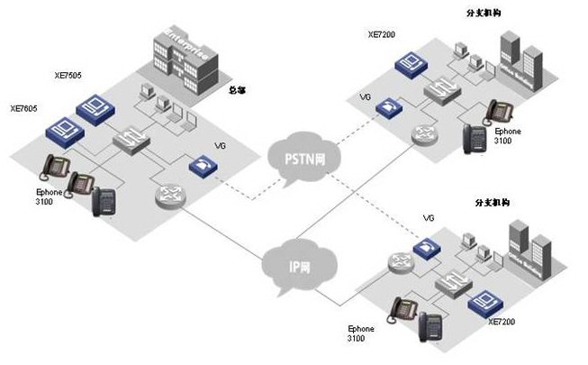 各小分支機構(gòu)的IP語音終端可以直接注冊到本地XE 7000上, 從而實現(xiàn)整網(wǎng)的分布式部署。